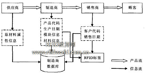 (1)RFID是通過標簽對產(chǎn)品信息采集和跟蹤的,當制造商完成產(chǎn)品的生產(chǎn)過程后,把與之配套的載有產(chǎn)品基本物理信息(包括產(chǎn)品代碼、生產(chǎn)f3期、模塊信息和材料信息)的標簽置入相應(yīng)產(chǎn)品上,這是RFID的準備階段,同時插入標簽的產(chǎn)品相關(guān)信息將會被發(fā)送至制造商數(shù)據(jù)庫收集起來。