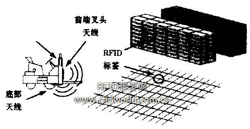 在托盤的適當位置埋藏RFID標簽,該標簽標識了該托盤的ID。在叉車叉取托盤時,叉車天線就能夠讀取托盤ID,自動地收集托盤信息,從而有效地管理配送中心的數量龐大的托盤。