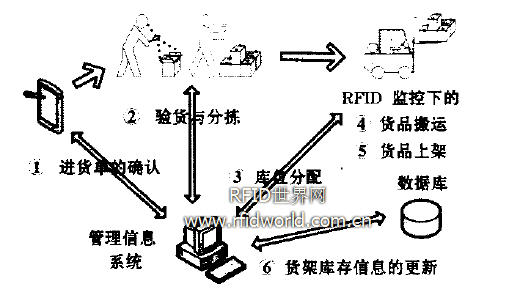 ⑤ RFID監(jiān)控下的貨品上架:上架時叉車上的天線將讀取到正在上架的貨位標簽,系統(tǒng)根據之前確定的庫位分配信息來確認托盤(即貨品)是否放入正確的貨位,如有錯誤及時發(fā)出警告。