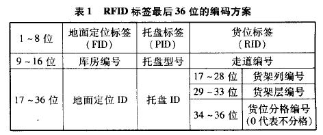 該階段主要對RFID標簽、天線以及閱讀器進行調研、選型及性能進行測試。標簽采用EPC CLASS1 GEN2標準的無源標簽,存儲容量96位(bit)。根據通用標識符(GID一96)EPC標簽數據標準進行定義 :前8位為標頭(Header),統(tǒng)一使用0x35(十六進制)表示。接下來28位為廠商識別代碼(GeneralManager Number):是由EPC統(tǒng)一分配的企業(yè)代碼,目前暫時借用VERISIGN公司提供測試的標簽代碼0xOO24ABD。緊接的24位為對象分類代碼(Object Class):目前在系統(tǒng)中有三種對象需要區(qū)分—— 地面定位(Floor ID)、貨位標簽(Rack ID)和托盤(PMlet ID),分別以0x000065、0xOO0066和0x000067進行表示。最后36位為序列號(SefiM Number):其中前8位自行定義為配送中心代碼(最大可用數量256),其余各位段根據定義對象的不同,進行相應的定義(如表1所示)。故當閱讀器讀到一張標簽的數據為0x35,0024ABD,000065,O1,0l,XXXXX時,就可以確認為其是一張貼于01號配送中心0l號庫房的XXXXX號地面定位標簽。