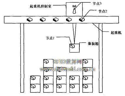 集裝箱堆場中有多個矩形的集裝箱堆放區(qū)域,每個區(qū)域可并列排放4個一6個箱子,每一排可疊放4層一6層,每個區(qū)域有1架集裝箱起重器來負責對區(qū)域內(nèi)的集裝箱進行搬運操作,整個堆場有2.4 GHz的無線網(wǎng)絡(luò)覆蓋。圖l說明了系統(tǒng)的網(wǎng)絡(luò)結(jié)構(gòu)。