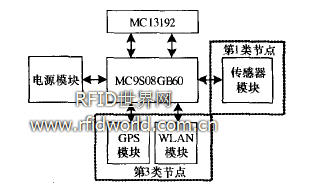 節(jié)點的硬件結(jié)構(gòu)如圖3所示。其中,控制芯片和發(fā)射芯片分別為MC9S08GT60” 微處理器與MC13192 2.4 GHz無線收發(fā)芯片 。第1類節(jié)點中安裝了加速度傳感器,用來感知集裝箱的運動狀態(tài)。第3類節(jié)點通過串ISI連接Levave公司提供的R36 GPS定位模塊,用于獲得集裝箱起重器的位置信息,并連接WLAN模塊來完成傳感器網(wǎng)絡(luò)與WLAN的橋接。