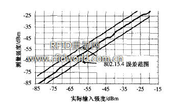 集裝箱的位置信息由第2類節(jié)點根據(jù)收到第1類節(jié)點的信號強度計算獲得。MC13192芯片提供計算輸入信號強度的功能,并由SMAC層的接口函數(shù)提供給上層應用。其感應靈敏度如圖5所示,最小輸入信號強度可達-85 dBm。