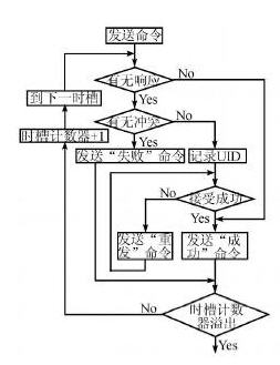 在讀寫器天線所覆蓋的范圍之內(nèi)有多個標(biāo)簽存在時,讀寫器發(fā)送命令后,會引起響應(yīng)沖突,從而導(dǎo)致通信失敗。當(dāng)讀寫器檢測到?jīng)_突后,可使用命令來處理存在的沖突。通過發(fā)送命令可以記錄讀寫器天線覆蓋范圍內(nèi)的標(biāo)簽的UID,然后利用UID的唯一性,讀寫器和各個標(biāo)簽分別建立獨立的通道進行通信,從而消除沖突。讀寫器首先發(fā)送命令給標(biāo)簽,在命令的數(shù)據(jù)域和參數(shù)域中分別包含UID的掩碼和掩碼的長度,傳送給標(biāo)簽的掩碼要求是整字節(jié),如果此掩碼不是整字節(jié)的話將自動在高位補零。通過設(shè)置標(biāo)志域的相應(yīng)標(biāo)志位,讀寫器可以設(shè)置接收標(biāo)簽響應(yīng)的時隙為3或6,在各時隙中,讀寫器都可以接收標(biāo)簽返回的UID,讀寫器通過發(fā)送結(jié)束信號的UID和當(dāng)前時隙序號的最低4bit加命令數(shù)據(jù)域中的掩碼進行比較,如果不匹配則無應(yīng)答,如果匹配將送回自己的UID。在某一時隙可能出現(xiàn)多個標(biāo)簽同時做出響應(yīng),這時讀寫器要記下沖突的標(biāo)簽掩碼和時隙計數(shù)器的值,以做進一步?jīng)_突處理。流程圖如圖7。