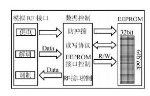 標(biāo)簽IC主要由模擬、數(shù)據(jù)處理及EEPROM三個模塊構(gòu)成,如圖2所示。