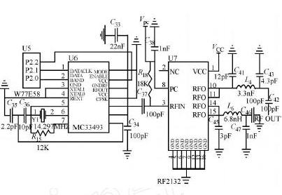 為了提高系統(tǒng)的發(fā)射功率,本設(shè)計選用了RFMicroDevice 公司的RF2132功率放大芯片對MC33493輸出的射頻信號進行功率放大;RF2132是一種高功率、高效率的線性放大器,具有29dBm的線性輸出功率。