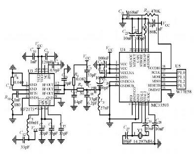 為了提高系統(tǒng)的接收靈敏度,本設(shè)計在天線和射頻接收/解調(diào)器之間增加了一套射頻信號放大電路,主要由RF2173組成,其功能是用于對天線接收到的射頻信號進行放大,以提高MC33593輸入射頻信號的信號強度;RF2173具有最大32dB的增益。