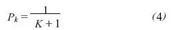 n>1時(shí)發(fā)生碰撞,令發(fā)生碰撞后所有爭用信道的射頻卡自行產(chǎn)生推遲時(shí)長kTA,其中k為射頻卡時(shí)延隨機(jī)因子,它是[0,K]內(nèi)均勻分布的隨機(jī)數(shù),K為讀寫器設(shè)計(jì)給定的時(shí)限,k、K均為正整數(shù).產(chǎn)生k的概率為