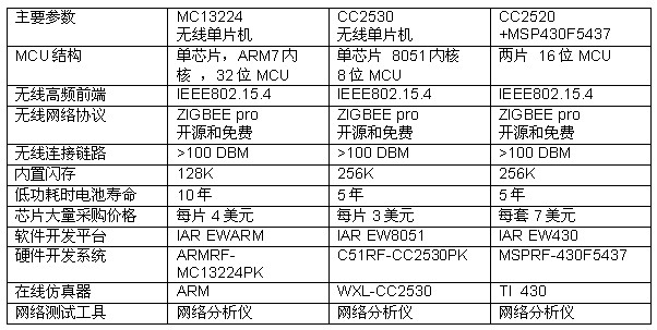 目前TI公司和FREESCALE公司推出的3套最新無線單片機(jī)解決方案:MC13224, CC2530, MSP430F5437+CC2520, 都是很好的SoC 微控制器解決方案,(見表一) 這些方案的特點(diǎn)是,高度集成化設(shè)計(jì),微處理器和無線收發(fā)部分在同一芯片內(nèi)部,需要電路板面積小于2平方厘米,外圍只小于很少零件,就有很強(qiáng)抗干擾能力。工業(yè)無線傳感器網(wǎng)絡(luò)的網(wǎng)關(guān),路由器和傳感器節(jié)點(diǎn),都可以使用同一微處理器來設(shè)計(jì);