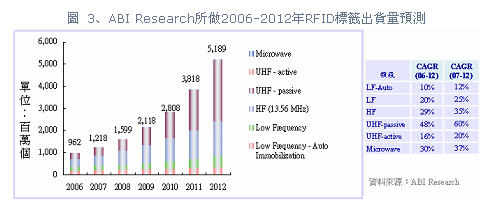 圖3、ABI Research所做2006-2012年RFID標(biāo)簽出貨量預(yù)測(cè)