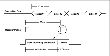 除了譯碼時間外,輪詢操作必須首先具備接收器"喚醒"和穩(wěn)定時間。大多數(shù)放大電路可以快速喚醒,但VCO晶體是機電元件,它需要一定的起振時間,當然,它還需要更長的時間才能穩(wěn)定在所要求的頻率。對于傳統(tǒng)的超外差接收機,該時間通常需要2ms至5ms。而MAX1470的VCO從上電到晶體穩(wěn)定振蕩只需0.25ms。于是,在每20ms內(nèi),通過喚醒檢測發(fā)射信號只需要1ms (0.75ms解碼、0.25ms穩(wěn)定) (圖2)。可快速喚醒的MAX1470工作電壓為3.3V,而不是5V,這是節(jié)省能量并延長電池壽命的四個或五個因素中的一個(相對于傳統(tǒng)的超外差接收機)。
