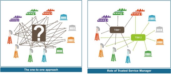 TSM可做為商務(wù)中繼者(commercial intermediary),協(xié)助安排服務(wù)供應(yīng)商和行動(dòng)電信業(yè)者之間的合約和其它進(jìn)行中的商業(yè)關(guān)系,進(jìn)而加速行動(dòng)NFC應(yīng)用的成功建置和起飛。
