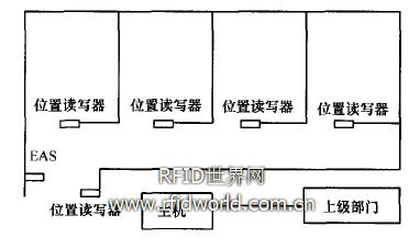 管理系統(tǒng)的硬件主要包括EAS電子物品監(jiān)控系統(tǒng)(electronic article surveillance)、位置讀寫(xiě)器、便攜式讀寫(xiě)器等,其系統(tǒng)的整體方案結(jié)構(gòu)如圖1所示。其中主機(jī)安裝了管理軟件,并與所有的位置讀寫(xiě)器連接并對(duì)它們進(jìn)行讀寫(xiě)控制,如讀取記錄、統(tǒng)計(jì)查詢(xún)等。電子標(biāo)簽存儲(chǔ)設(shè)備的名稱(chēng)、廠(chǎng)家、型號(hào)、生產(chǎn)日期、產(chǎn)品標(biāo)號(hào)等信息。
