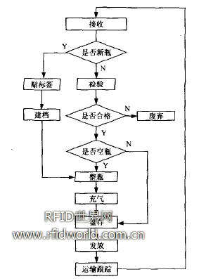 針對鋼瓶的作業(yè)主要涉及鋼瓶建檔、標簽粘貼、空瓶清點、鋼瓶檢驗、整瓶、鋼瓶充裝、鋼瓶盤存和鋼瓶發(fā)放等,其典型工作流程如圖3所示。