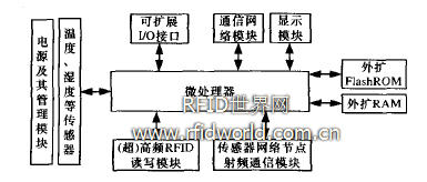 RFID讀寫器與WSNs網關(中心節(jié)點)具有相似的基礎功能結構,本文研發(fā)的(超)高頻RFID和傳感器網絡綜合控制器兼顧2類部件的功能,其結構框圖如圖5所示”。