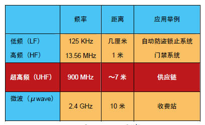 基本的RFID系統(tǒng)由三部分組成:天線或線圈、帶RFID解碼器的收發(fā)器和RFID電子標(biāo)簽(每個標(biāo)簽具有唯一的電子識別碼)。表1顯示了常用的四個RFID頻率及其潛在的應(yīng)用領(lǐng)域。其中,目前商業(yè)上應(yīng)用最廣的是超高頻(UHF),它在供應(yīng)鏈管理中有可能得到廣泛的應(yīng)用。
