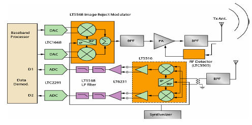 接收器的核心是Linear公司的LT5516,這是一種高度集成化的直接轉(zhuǎn)換正交解調(diào)器,芯片上提供了一個精確正交移相器(0度至90度)。來自天線的信號在通過射頻濾波器之后,通過一個不平衡變壓器直接輸入到解調(diào)器輸入端口。由于LT5516的噪聲系數(shù)很低,在不需要低噪放大器(LNA)的情況下,仍能保持其21.5dBm IIP3和9.7dB P1dB的性能。