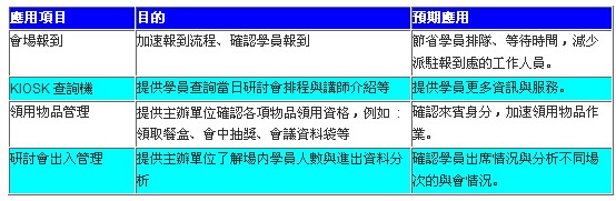 表1、會(huì)展RFID應(yīng)用系統(tǒng)于IDEAS Week之目的與預(yù)期應(yīng)用