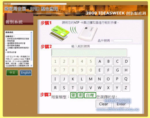 國(guó)際大展如德國(guó)Organic Electronics Conference、法蘭克福IMAX會(huì)展皆已應(yīng)用RFID于會(huì)展報(bào)到,甫于去年舉行的北京奧運(yùn)會(huì)與2010年的上海世博會(huì)也將使用RFID票券,RFID科技的引入有助主辦單位對(duì)會(huì)場(chǎng)秩序的控管、減少學(xué)員耗時(shí)排隊(duì)的機(jī)會(huì)。
