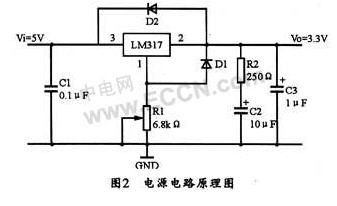 本設(shè)計(jì)需要3.3 V電壓。故可用三端可調(diào)輸出集成穩(wěn)壓器LM317來(lái)產(chǎn)生3.3 V電壓。圖2所示是用LM317產(chǎn)生3.3 V電源電壓的電路原理圖。