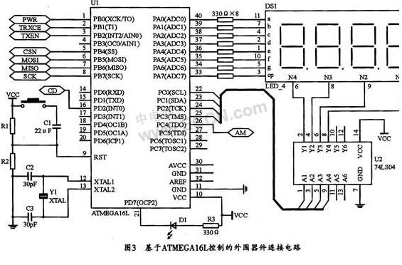 ATMEGA16L單片機(jī)內(nèi)含一個(gè)標(biāo)準(zhǔn)的SPI接口,可用于單片機(jī)與單片機(jī)或外設(shè)之間進(jìn)行高速同步數(shù)據(jù)傳輸。它使用標(biāo)準(zhǔn)的四線(xiàn)接口。SCK、MISO、MOSI、/SS分別與PB7、PB6、PB5和PB4復(fù)用。在硬件設(shè)計(jì)時(shí),本設(shè)計(jì)把MCU的SPI接口、nRF905的SPI接口.以及另外選定的幾個(gè)I/O口連接到nRF905的輸入輸出信號(hào)。ATMEGA16L與外圍器件的連接電路見(jiàn)圖3所示。