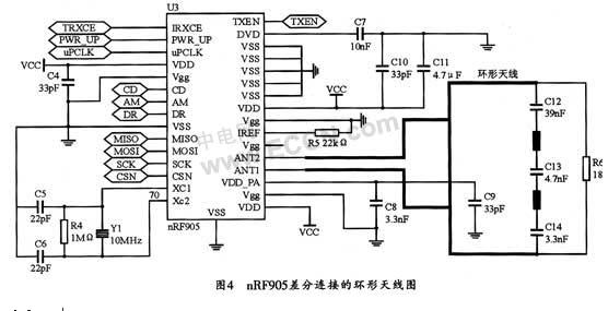 本系統(tǒng)的無(wú)線(xiàn)發(fā)射接收電路主要利用nRF905與外圍器件構(gòu)成的電路組成,其主要部分是天線(xiàn)。簡(jiǎn)而言之,就是一個(gè)特定形狀的導(dǎo)體,它可以將電流轉(zhuǎn)化為射頻能量并以電波形式發(fā)射出去.或?qū)o(wú)線(xiàn)電波接收進(jìn)來(lái)。任何一個(gè)無(wú)線(xiàn)系統(tǒng)都有天線(xiàn),天線(xiàn)設(shè)計(jì)的好壞直接影響無(wú)線(xiàn)系統(tǒng)的收發(fā)能力。圖4所示是用nRF905差分連接的環(huán)形天線(xiàn)圖。