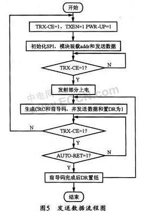 發(fā)送數(shù)據(jù)時(shí)的工作流程如圖5所示。當(dāng)MCU有遙控?cái)?shù)據(jù)節(jié)點(diǎn)時(shí),接收點(diǎn)的地址(TX-address)和有效數(shù)據(jù)(Tx-payload)將通過(guò)SPI接口傳送給nRF905。設(shè)計(jì)時(shí)應(yīng)使用協(xié)議或MCU來(lái)設(shè)置接口速度。