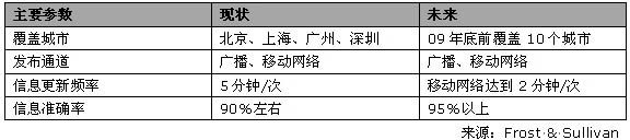 從信息發(fā)布的平臺(tái)來(lái)看,廣播、通信網(wǎng)絡(luò)、互聯(lián)網(wǎng)都可以承載動(dòng)態(tài)交通信息的發(fā)布。從商用案例上來(lái)看,廣播服務(wù)目前仍是動(dòng)態(tài)交通信息主要的發(fā)布通道。其中,世紀(jì)高通有望在2009年底前率先實(shí)現(xiàn)10個(gè)城市的動(dòng)態(tài)交通信息廣播服務(wù)覆蓋。