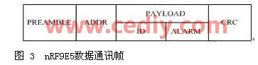 nRF9E5規(guī)定一幀數(shù)據(jù)由前導(dǎo)碼( PREAMBLE ),本機(jī)物理地址(ADDR),有效數(shù)據(jù)(PAYLOAD),CRC校驗(yàn)碼(CRC)組成。其幀結(jié)構(gòu)如圖3。