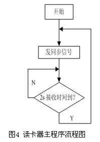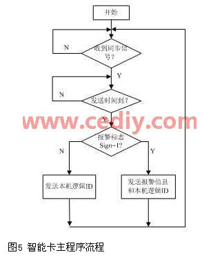 本系統(tǒng)定位基站里的讀卡器每5s發(fā)一次同步信號(hào)(0xee,0xee)。智能卡接到該同步信號(hào)后,根據(jù)自己的ID產(chǎn)生一延時(shí)以等待屬于自己的時(shí)間片,延時(shí)到立即將自己的一幀數(shù)據(jù)發(fā)送給讀卡器。報(bào)警信息的按鍵值是在按鍵中斷程序里設(shè)置的。該中斷程序里還會(huì)設(shè)置一報(bào)警標(biāo)志(Sign),以供智能卡主程序判斷。讀卡器主程序和智能卡的主程序流程圖如圖4,圖5。