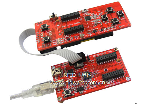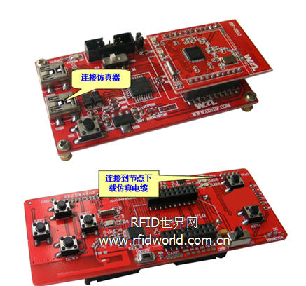 3、根據(jù)需要將仿真器分別連接無線節(jié)點板,進(jìn)行下載和調(diào)試,首先進(jìn)行第一號節(jié)點,作為終端節(jié)點使用。