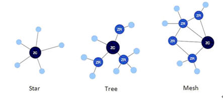 在ZigBee網(wǎng)絡(luò)中,有三種主要的網(wǎng)絡(luò)拓?fù)洌謩e是星狀、樹狀和網(wǎng)狀,如圖7所示。