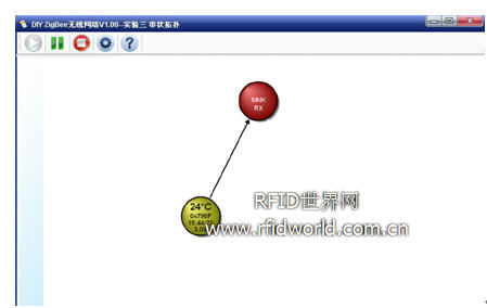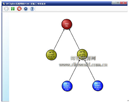 經(jīng)過幾秒鐘等待,你可以從DIYRF-2480 PC網(wǎng)絡(luò)監(jiān)控軟件看到這里出現(xiàn)了兩個不同類型的節(jié)點。如圖13所示,紅色是網(wǎng)關(guān) 節(jié)點,黃色是路由節(jié)點。如果你選購了更多的LC2480節(jié)點和無線底板和模塊,例如再加兩個無線傳感器節(jié)點,你可以看到如圖13所示的圖像,有5個節(jié)點在這個ZigBee網(wǎng)絡(luò)中間,藍(lán)色為終端節(jié)點。你可以簡單關(guān)閉電源開關(guān),節(jié)點會從屏幕上消失,然后打開電池開關(guān),節(jié)點會重新加入網(wǎng)絡(luò)。