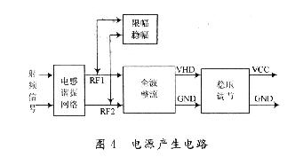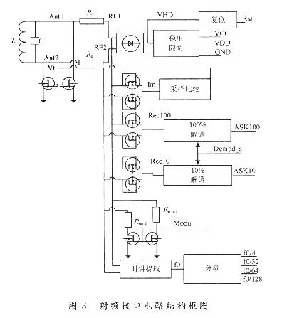 射頻接口電路包括電源產(chǎn)生電路、調(diào)制解調(diào)電路、時(shí)鐘產(chǎn)生電路和復(fù)位電路。結(jié)構(gòu)如圖3所示。