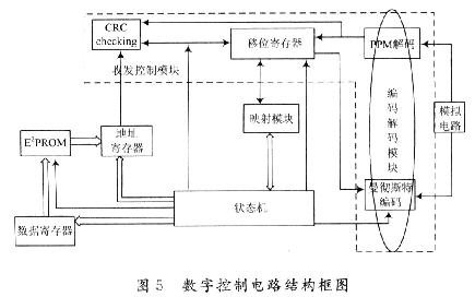 數(shù)字控制電路是整個(gè)芯片的重要的功能模塊,它接收來自射頻接口電路的解調(diào)后的信號(hào)以及13.56 MHz的時(shí)鐘信號(hào).對(duì)解調(diào)信號(hào)解碼并進(jìn)行處理。在數(shù)字控制電路的控制下,對(duì)E2PROM進(jìn)行讀寫操作,并對(duì)返回?cái)?shù)據(jù)進(jìn)行編碼后送人射頻接口電路。數(shù)字控制電路系統(tǒng)由收發(fā)控制模塊(編解碼子模塊、CRC子模塊和移位寄存器)、映射模塊、狀態(tài)機(jī)等組成。整個(gè)數(shù)字控制電路結(jié)構(gòu)框圖如圖5所示。
