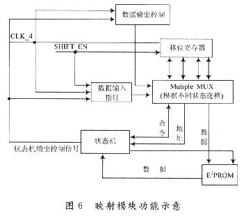 映射模塊實(shí)質(zhì)上是一些特殊的數(shù)據(jù)通道,它將狀態(tài)機(jī)、收發(fā)移位寄存器以及存儲(chǔ)器分別對(duì)應(yīng)連接起來,實(shí)現(xiàn)數(shù)據(jù)和命令的分離。映射模塊功能示意如圖6所示。