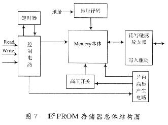 電子標(biāo)簽芯片要存儲(chǔ)數(shù)據(jù),采用的辦法有:電可擦可編程只讀存儲(chǔ)器(E2PROM)、鐵電隨機(jī)存取存儲(chǔ)器(FRAM)以及靜態(tài)隨機(jī)存取存儲(chǔ)器(SRAM)。E2PROM的寫入電壓高,高電壓產(chǎn)生難以控制,操作速度慢,讀寫次數(shù)少等缺點(diǎn)在相當(dāng)程度上制約了RFID芯片的發(fā)展。鐵電存儲(chǔ)器具有工作電壓低,操作速度快,讀寫次數(shù)多,功耗低等優(yōu)點(diǎn),是一種非常理想的可以替代E2PROM的非揮發(fā)性存儲(chǔ)器,但由于是利用熱釋電晶體中自發(fā)極化可以在外加電場的作用下發(fā)生反向的原理,使得FRAM在生產(chǎn)工藝中遇到了更大的問題,這阻礙了它贏得市場。SRAM主要用于微波系統(tǒng),需要用輔助電池不斷供電,才能永久性保存數(shù)據(jù),不適用于無源電子標(biāo)簽芯片存儲(chǔ)數(shù)據(jù)。E2PROM目前生產(chǎn)工藝和設(shè)計(jì)技術(shù)相對(duì)成熟,在存儲(chǔ)速度、成本等方面都能滿足電子標(biāo)簽芯片設(shè)計(jì)要求,E2PROM要達(dá)到應(yīng)用的要求,需要采用全定制設(shè)計(jì),其中較多的是模擬電路,如何設(shè)計(jì)成功是電子標(biāo)簽芯片實(shí)現(xiàn)的關(guān)鍵。E2PROM存儲(chǔ)器主要由存儲(chǔ)陣列、地址(字線)譯碼模塊、高壓控制電路、讀寫控制模塊、數(shù)據(jù)移位寄存器和電荷泵等組成。總體結(jié)構(gòu)如圖7所示。電荷泵產(chǎn)生E2PROM寫操作時(shí)的高壓,高壓控制模塊對(duì)E2PROM寫時(shí)的高壓進(jìn)行控制,讀寫控制模塊控制位線讀或?qū)憰r(shí)的電壓,移位寄存器用于對(duì)E2PR()M進(jìn)行讀寫操作時(shí)數(shù)據(jù)的串行移位輸出或輸入。