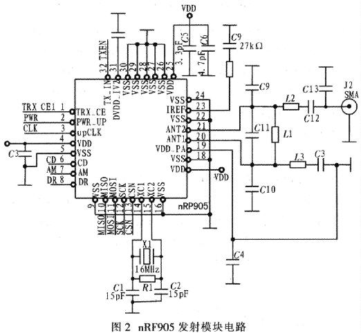 無線收發(fā)部分采用nRF905單片射頻收發(fā)器,它可工作于433/868/915 MHz 3個:ISM(工業(yè)、科學(xué)和醫(yī)學(xué))頻道,內(nèi)部集成有頻率調(diào)制器、帶解調(diào)器的接收器、功放、晶體振蕩器和調(diào)節(jié)器。nRF905主要特點:頻道間的轉(zhuǎn)換時間小于650 μs。工作電壓為1.9~3.6 V,32引腳QFN封裝。自動產(chǎn)生前導(dǎo)碼和CRC校驗碼,可很容易通過SPI接口編程配置。外圍器件連接簡單,無需外部SAW濾波器。nRF905有ShockBurst TM發(fā)送ShockBurst RM接收兩種工作模式以及掉電和SPI編程模式、STANDBY和SPI編程模式兩種節(jié)能模式。nRF905的工作模式由TRX_CE、TX_IN、PWR_UP這3個引腳設(shè)置決定。圖2為nRF905發(fā)射模塊電路。