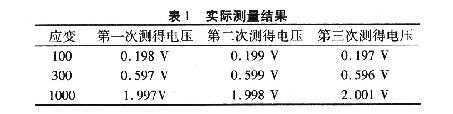 在實驗室中對該系統(tǒng)設(shè)計進行測試。其中一個應(yīng)變對應(yīng)0.002 mV,A/D轉(zhuǎn)換器的參考電壓為2.5 V,測試中分別選取100、300、1 000不同的微應(yīng)變時所對應(yīng)的電壓值,然后進行無線發(fā)射。實際測量結(jié)果見表1所示,由表1可看出:3次測得值均在允許的誤差范圍內(nèi),無線數(shù)據(jù)的發(fā)送和接收完全相同,滿足實際工程應(yīng)用標(biāo)準(zhǔn)。