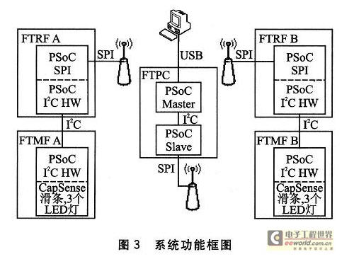 由于CyFi使用的是星型廣播式網(wǎng)絡(luò)協(xié)議,所有消息需要經(jīng)過中心Hub,故實現(xiàn)節(jié)點A到節(jié)點B數(shù)據(jù)通信的過程如下:節(jié)點A通過I2C協(xié)議采集多功能板A的CapSense觸摸滑塊的位置、3個LED燈的亮滅情況等數(shù)據(jù),并與目標節(jié)點B的ID號一起通過RF發(fā)送出去;Hub檢測到網(wǎng)絡(luò)中有消息后,再根據(jù)消息中的目標節(jié)點ID將消息轉(zhuǎn)發(fā)出去,同時將數(shù)據(jù)保存到緩存中等待PC機讀取;節(jié)點B接收到消息之后根據(jù)消息中的數(shù)據(jù),同樣通過I2C協(xié)議控制多功能板B上的3個LED燈的亮滅。其中Hub所在設(shè)備FTPC有2個PSoC內(nèi)核:主內(nèi)核實現(xiàn)USB—I2C轉(zhuǎn)換和各個板卡(包括從內(nèi)核)的編程功能;從內(nèi)核實現(xiàn)Hub功能,同時通過I2C與主內(nèi)核連接。系統(tǒng)功能框圖如圖3所示。