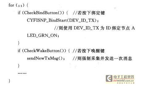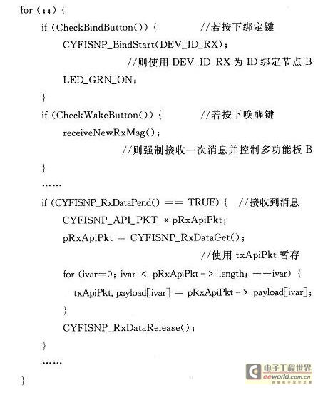 對于多功能板A可直接使用光盤上的MF_CS_SLIDE樣例,不需要修改。對于節(jié)點A使用的RF_12C_BRIDGE樣例,主函數(shù)中需修改調(diào)用CyFiSNP_BindStart()函數(shù)時的參數(shù),如下: