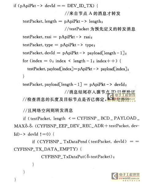 CY3271套件的光盤中提供了各個PSoC的設(shè)計樣例,本文中PSoC部分的設(shè)計就是在這些樣例的基礎(chǔ)上修改而成的。為了實現(xiàn)上述功能,需要在節(jié)點A發(fā)送的消息中添加目的節(jié)點B的ID信息,以便Hub將接收到的消息再轉(zhuǎn)發(fā)出去。每個CyFi收發(fā)器有2種ID;一種為6字節(jié)的Radio ID,此ID在收發(fā)器出廠時燒入,不可更改且全球唯一;另一種為1字節(jié)的Node ID,此ID在節(jié)點綁定時確定,可以事先指定也可以由Hub動態(tài)分配。由于Ra-dio ID較復(fù)雜,開發(fā)人員在開發(fā)過程中可以忽略RadioID,而只關(guān)注Node ID。