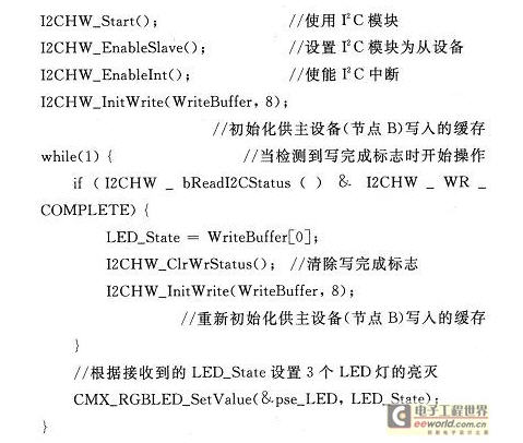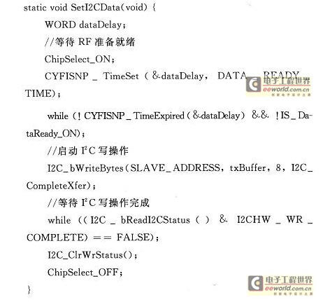 其中,負責(zé)接收消息并且控制多功能板B的函數(shù)receiveNewRxMsg()中必須與節(jié)點A對應(yīng)的將消息類型修改為CYFISNP_API_TYPE_CONF_BCDR,且在其中調(diào)用的SetI2CData()函數(shù)如下: