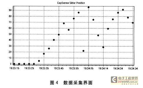 按照上述方法,再結(jié)合Hub的PSoC程序中定義的命令和:Bus Hound抓包得到的結(jié)果,就可以對FTPC設(shè)備中的Hub執(zhí)行相應(yīng)的操作了,如進入綁定狀態(tài),讀取綁定結(jié)果,讀取接收到的消息等。節(jié)點綁定成功之后,即可查看實時的數(shù)據(jù)采集情況,包括數(shù)據(jù)采集的時間和滑塊位置值等,如圖4所示。