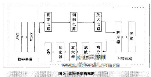 讀寫器是射頻識別系統(tǒng)不可缺少的設(shè)備裝置,是系統(tǒng)與諸多流動的電子標(biāo)簽進行數(shù)據(jù)交換的工具,是系統(tǒng)運行的關(guān)鍵環(huán)節(jié),其技術(shù)參數(shù)指標(biāo)對系統(tǒng)的整體性能和可靠性有著決定性影響。硬件設(shè)計是決定讀寫器性能的關(guān)鍵,其目標(biāo)是要達到閱讀距離遠(yuǎn)、識別速率快、識別率100%的要求。經(jīng)過研究發(fā)現(xiàn),能夠采取一些措施提高閱讀器的性能。針對超市應(yīng)用特點,我們設(shè)計了一個無源后向散射式RFID讀寫器。從構(gòu)成上,它可以分作兩個部分,即射頻前端和數(shù)字基帶 。圖2為讀寫器結(jié)構(gòu)框圖,射頻前端部分包括了發(fā)射電路、接收電路、環(huán)行器和天線;數(shù)字基帶包括DSP和FPGA芯片。其中,發(fā)射電路可以細(xì)分為載波電路、調(diào)制電路、放大電路,其工作過程如下:(1)載波電路通過鎖相環(huán)控制壓控振蕩器,產(chǎn)生載波頻率(860~960MHz),送至調(diào)制電路;(2)調(diào)制電路中混頻器將載波信號和讀寫器的基帶信號混合成調(diào)制信號,經(jīng)過低噪聲放大器和濾波后,送至放大器;(3)讀寫器根據(jù)需要通過衰減器調(diào)節(jié)發(fā)射信號的增益,發(fā)射信號經(jīng)過RF功率放大器后經(jīng)環(huán)形器送至讀寫器天線發(fā)出。