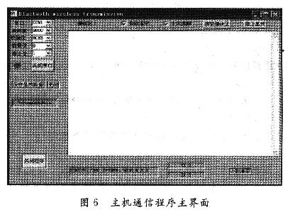 主機和藍牙接收模塊之間的數(shù)據(jù)傳輸采用RS 232串口連接。采集到的數(shù)據(jù)通過藍牙傳輸?shù)浇邮漳K之后,通過RS 232接口傳輸?shù)街鳈C上。接口硬件采用金甌公司的藍牙模塊RS轉(zhuǎn)換器。通信軟件由VC編寫,將傳感器節(jié)點測量的數(shù)據(jù)通過藍牙傳輸?shù)街鳈C,顯示出來以便進行數(shù)據(jù)處理。主機通信程序主界面如圖6所示。