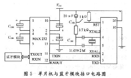 這里有一個電平轉(zhuǎn)換的問題。單片機發(fā)出的信號是TTL信號,所以在與藍牙模塊進行數(shù)據(jù)前,需要把它轉(zhuǎn)化成RS 232電平。本系統(tǒng)中采用MAX232進行電平轉(zhuǎn)換。接口電路圖如圖5所示。