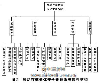 移動(dòng)存儲(chǔ)載體安全管理系統(tǒng)軟件主要由系統(tǒng)維護(hù)管理、存儲(chǔ)載體日常管理、存儲(chǔ)載體查詢(xún)統(tǒng)計(jì)、存儲(chǔ)載體授權(quán)管理和存儲(chǔ)載體監(jiān)控管理五大模塊組成。其中:系統(tǒng)維護(hù)管理模塊用于對(duì)用戶(hù)、識(shí)別基站參數(shù)配置、系統(tǒng)數(shù)據(jù)和集成結(jié)口進(jìn)行管理;移動(dòng)存儲(chǔ)載體信息管理用于管理存儲(chǔ)載體注冊(cè)、登記和標(biāo)識(shí)捆綁;存儲(chǔ)載體查詢(xún)統(tǒng)計(jì)模塊提供對(duì)系統(tǒng)記錄的存儲(chǔ)載體信息的組合查詢(xún),并匯總生成打印報(bào)表;存儲(chǔ)載體監(jiān)控管理模塊提供存儲(chǔ)載體出入報(bào)警設(shè)置、出入日志查詢(xún)和出入?yún)R總報(bào)表生成功能。移動(dòng)存儲(chǔ)載體安全管理系統(tǒng)軟件結(jié)構(gòu)如圖2所示。