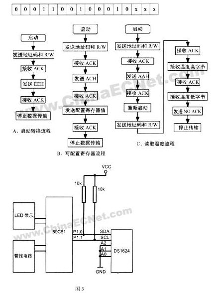 ds1624 啟動溫度轉(zhuǎn)換、訪問配置寄存器、讀取溫度值的流程圖見圖2。