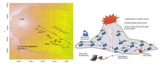 美國哈佛大學(xué)在去年部署了一套類似的應(yīng)急地震監(jiān)測系統(tǒng),主要部署在火山地區(qū)用來監(jiān)測因火山爆發(fā)而導(dǎo)致的地震信息。系統(tǒng)采用TelosB無線傳感器節(jié)點,搭載24位ADC用以監(jiān)測MEMS加速度計傳送的微弱振動信息。節(jié)點以火山口為中心徑向部署,間隔數(shù)百米部署一個節(jié)點。在部署完畢后可以監(jiān)測出地震沿徑向傳播各點的振動信息。